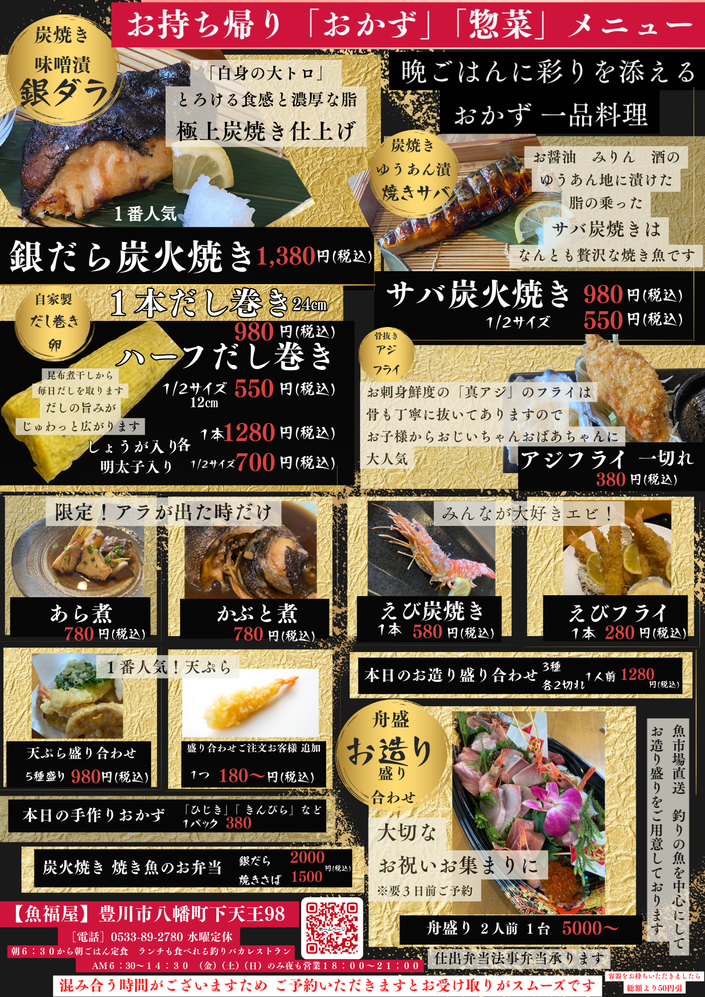 営業時間 6:30~14:00 朝ごはん定食はAM10:00まで 朝昼はお魚和定食 17:00~21:00 夜はお魚レストラン・イタリアン (月)(木)定休日 |